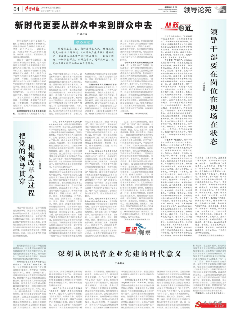 最后,党的全面领导是全面完成机构改革任务的根本保证。党和国家机构改革属于党和国家领导制度改革范畴,是政治体制改革的重要任务。改革开放以来,党中央部门进行了4次机构改革,国务院部门进行了7次机构改革。这次党和国家机构改革,涉及党、人大、政府、政协、司法、事业单位、群团、社会组织以及跨军地等众多方面,涉及部门之多、职能调整之大、影响面之广,可谓前所未有。通过党对机构改革的全面领导,对以上问题加以攻坚,既是这次改革的一大亮点,也体现了我党的改革智慧,更是顺利完成改革任务的根本保证。